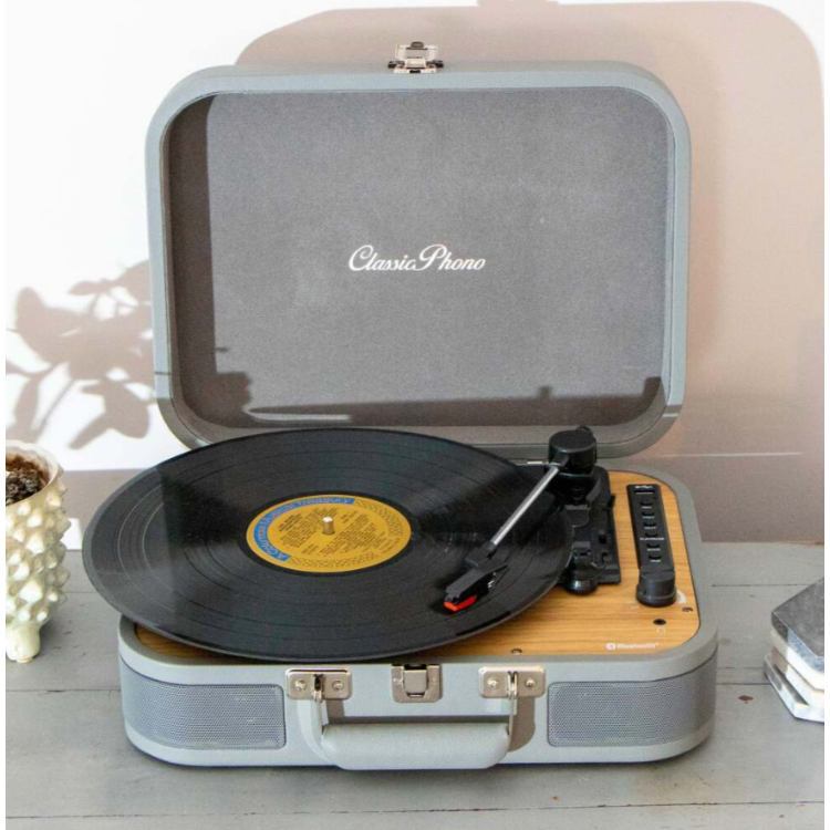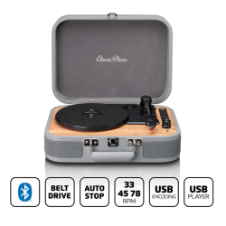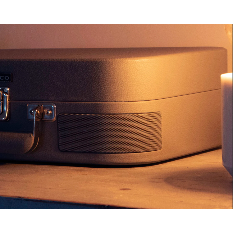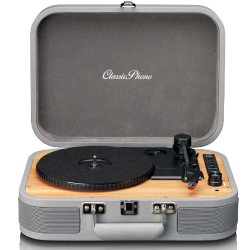 Classic Phono TT-116GY je t. i. gramofon v kovčku – prenosni gramofon v obliki kovčka, ki je enostaven za prenašanje in uporabo. Odprite retro ohišje in takoj poslušajte svoje najljubše vinilne plošče prek vgrajenih zvočnikov. Gre za popolnoma samostojen gramofon, ki ne potrebuje dodatnih zvočnikov. Trpežno ohišje z ročajem poskrbi za optimalno zaščito vašega gramofona.