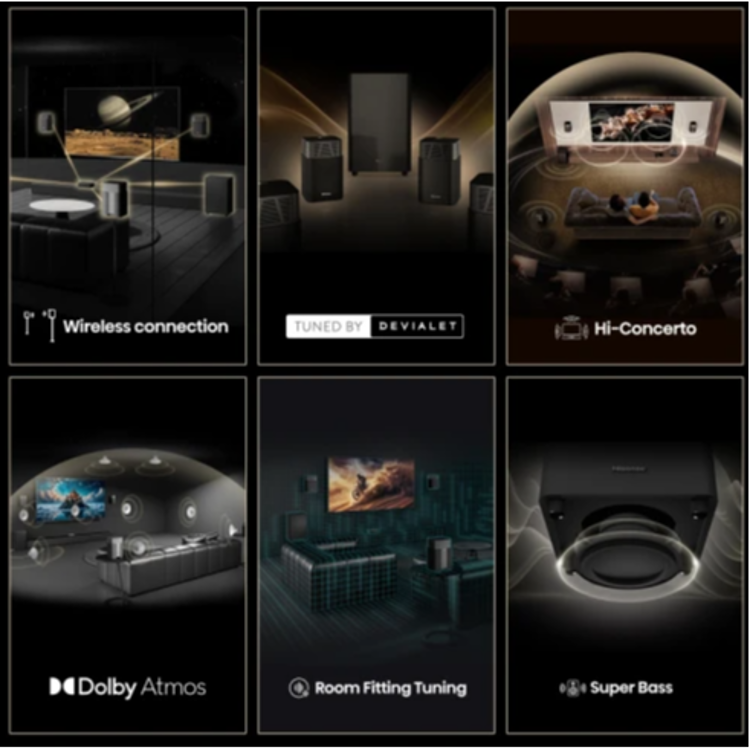 Doživite izboljšan prostorski zvok s HT Saturn in televizorjem, ki delujeta skupaj in hkrati uporabljata vse razpoložljive zvočnike, da razširita zvočno polje in zagotovita resnično poglobljeno avdio izkušnjo. *Hi-Concerto deluje samo z izbranimi modeli televizorjev Hisense.