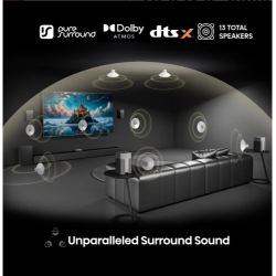 Potopite se v zvok kinematografske kakovosti z napredno tehnologijo prostorskega zvoka. Ekskluzivni algoritmi zagotavljajo zvok brez popačenj, medtem ko Dolby Atmos in DTS:X ustvarjata 3D-zvočno kuliso. Doživite vsako podrobnost in spremenite svoj dom v kino z močnimi zvočniki moči 720 W.
