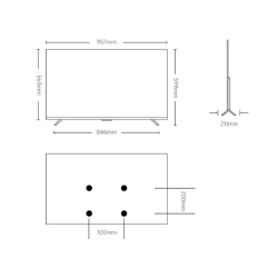 TV ima kovinski okvir in dvojno stojalo v barvi Dark Gray, kar zagotavlja stabilnost in premium videz. Dimenzije brez stojala so 957 × 72 × 563 mm, z osnovo pa 957 × 211 × 599 mm. Teža znaša 5,9 kg brez stojala in 6 kg s stojalom. Podpira stensko montažo 100 × 200 mm.