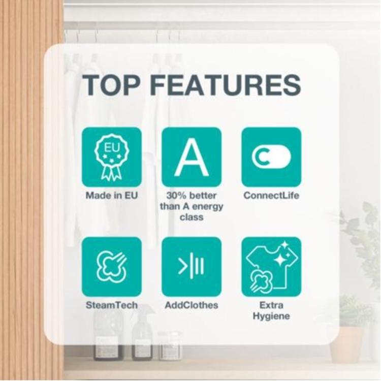 Parni program pranja ExtraHygiene, testiran in certificiran s strani Intertek, odstrani do 99,9 % bakterij in kvasovk iz vašega perila s pomočjo pare in pranja pri visokih temperaturah. Oblačila bodo popolnoma čista, hkrati pa bo tudi vaš pralni stroj ostal dlje časa čist – brez mikrobnih oblog in neprijetnih vonjav, ki so z njimi povezani.