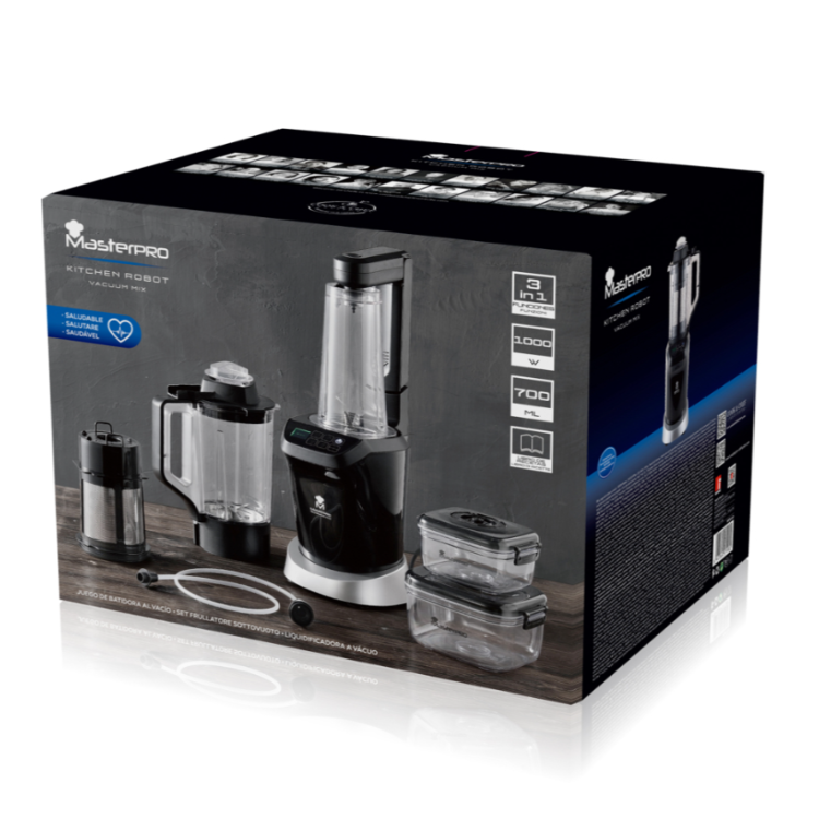 Vakuumski mešalnik priznane blagovne znamke Bergner MasterPro je opremljen z visokozmogljivim 1000 W motorjem, ki doseže 24.000 vrtljajev na minuto, kar omogoča hitro in učinkovito pripravo obrokov. Ojačana rezila iz nerjavečega jekla brez težav sesekljaj o tudi najtršo hrano.