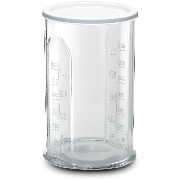 Priložen je mešalni lonček z merilno skalo, mešalna noga pa se enostavno odstrani s klik mehanizmom in se lahko pere v pomivalnem stroju. Poleg tega so vsi plastični deli, ki pridejo v stik z živili, brez BPA, kar poskrbi za varno pripravo hrane.