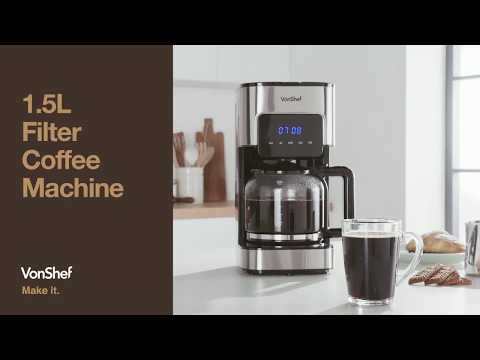 Z VonShef filtrirnim aparatom za kavo si doma pripravite okusno kavo in tako lažje začnite dan. Velik 1,5-litrski rezervoar za vodo - kar ustreza do 12 skodelic kave. Gumb ‘Mode’ omogoča nastavitev šibke, srednje ali močne koncentracije kave. Ogrevana plošča pod vrčem, ohranja kavo toplo do 35minut. Mrežasti filter je mogoče večkrat uporabiti in pomivati v pomivalnem stroju (priloženažlica ni pralna v pomivalnem stroju)