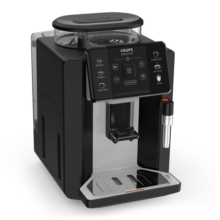 Krups Sensation C10 EA910A10 Popolnoma Avtomatski Kavni Aparat je zasnovan za ljubitelje kave, ki želijo brezskrbno uživati v popolnih napitkih vsak dan. S svojo močjo 1450 W in tlakom 15 barov zagotavlja vrhunsko kakovost kave. Kavni aparat je opremljen s kovinskim stožčastim mlinčkom in kapaciteto posode za kavna zrna, ki znaša 260 g. Rezervoar za vodo ima kapaciteto 1,7 L, pri čemer je zagotovljena funkcija za zaznavanje praznega rezervoarja. Sistem za čiščenje je popolnoma avtomatski, kar pomeni, da boste lahko uživali v brezskrbnem vzdrževanju aparata.