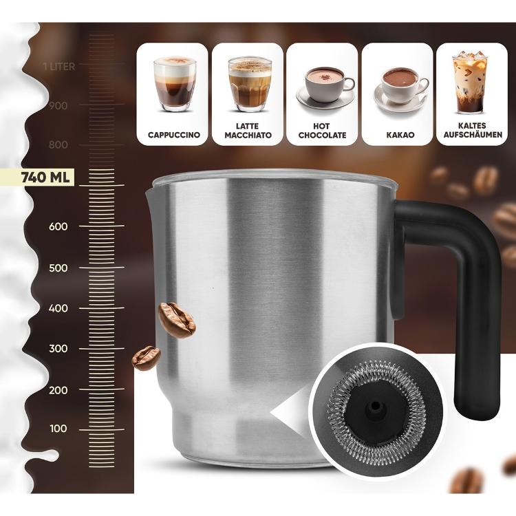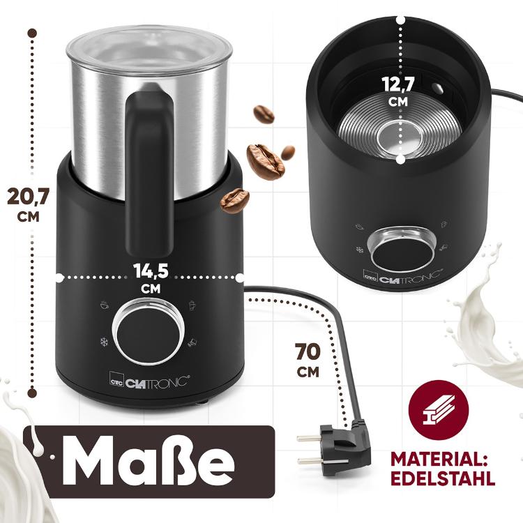 Penilec mleka Clatronic MS3812 (500 W) z novo vgrajeno funkcijo gretja – brez potrebe po predgretju mleka! Uživajte v popolno spenjenem mleku v le nekaj sekundah. Primerno za različne vrste mleka, kot so brez laktoze, mandljevo, sojino ali kozje mleko.