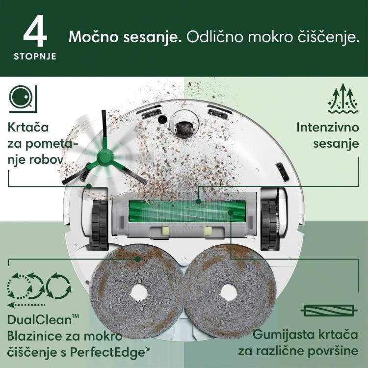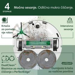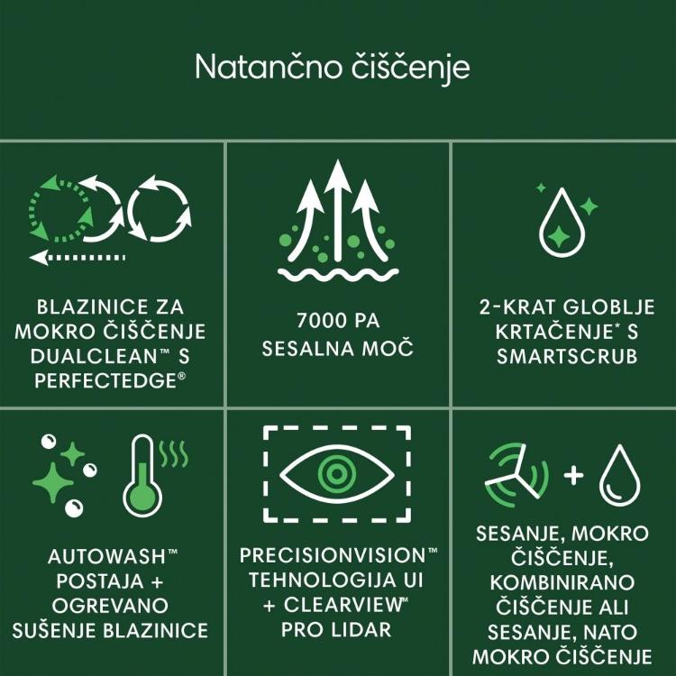 Z DualClean™ blazinicama za mokro brisanje in s PerfectEdge® tehnologijo se z blazinico za morko brisanje približa robovom za 18 % bližje kot običajno. Dinamična postaja samodejno izprazni umazanijo in med čiščenjem osveži blazinice za mokro čiščenje. Po končanem delu jih opere, posuši s toplim zrakom, nato pa očisti še samo sebe – za vedno svež začetek čiščenja.