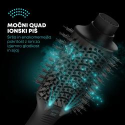 Z enim samim izdelkom si lahko posušite in oblikujete lase, da postanejo gladki in sijoči. 4v1 krtača za sušenje lase posuši, razplete, zgladi in hkrati oblikuje. Ovalno keramično ohišje krtače gladi in oblikuje lase, zaobljeni robovi pa pri koreninah dodajajo volumen.