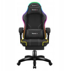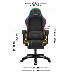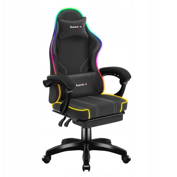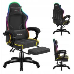Gre za črn gaming stol, primeren tako za igranje iger kot za vsakodnevno uporabo. Oblazinjen je z udobnim tekstilnim materialom in omogoča nastavitev višine sedeža ter nagib naslona. Opremljen je s podporo za ledveni del in vrat, naslonom za noge ter RGB osvetlitvijo ozadja. Nasloni za roke niso nastavljivi, masažne funkcije nima.