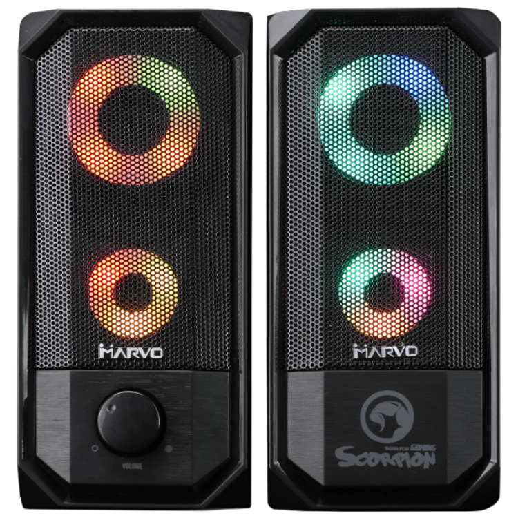 Gaming zvočnike Marvo krasi 7-barva osvetlitev z mavričnimi učinki, touch control za izbiro ON / OFF za osvetlitev ozadja, enostaven gumb za dostop do glasnosti, gumb ON / OFF za osvetlitev ozadja. Kakovostni zvočniki Marvo oddajajo čist in natančen zvok!