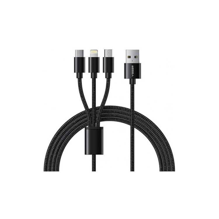 Vegerjev V303 polnilni kabel 3 v 1 je opremljen s tremi različnimi priključki, Type-C, Micro-USB in Lightning. Ima tanek dizajn, a odporen proti trganju, obrabi, obrabi in oksidaciji, kabel za polnjenje in prenos podatkov.