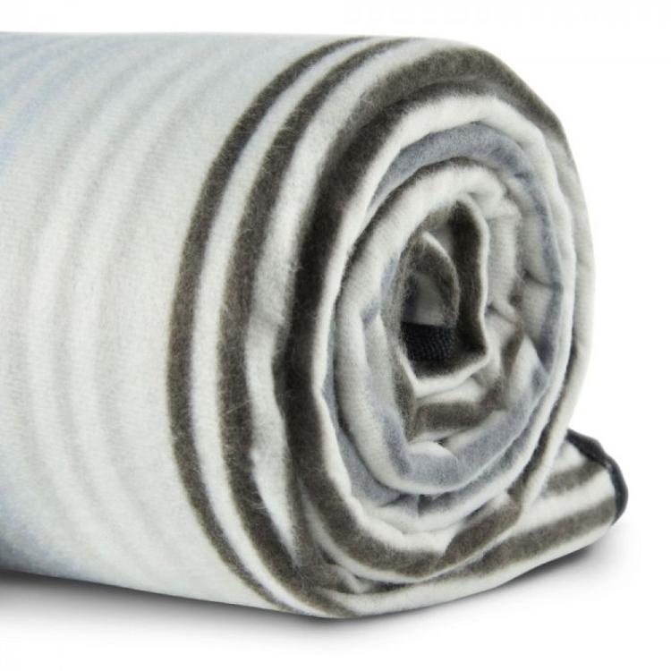 Njena elegantna zasnova s črtastim vzorcem, mehka flis tkanina in trpežna vodoodporna podloga iz PEVA materiala poskrbijo, da ostanete suhi in udobni, tudi na rahlo vlažni podlagi.