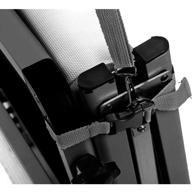 Zelo udobno ležišče s stabilnim, zložljivim okvirjem na treh nogah iz eloksiranega aluminija, visoko ležalno površino (V = 48 cm) iz tkanine Syntex Plus, odporne na vremenske vplive, in nastavljivim naslonom za hrbet. Dobavi je priložen praktičen nadstrešek za sončenje.
