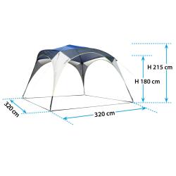 Zunanji paviljon z jeklenim okvirjem, zasnovan za zagotavljanje zaščite pred soncem in udobje na prostem. Idealna izbira za kampiranje, piknike ali druge aktivnosti na prostem, kjer potrebujete senco in zaščito pred neposredno sončno svetlobo.
