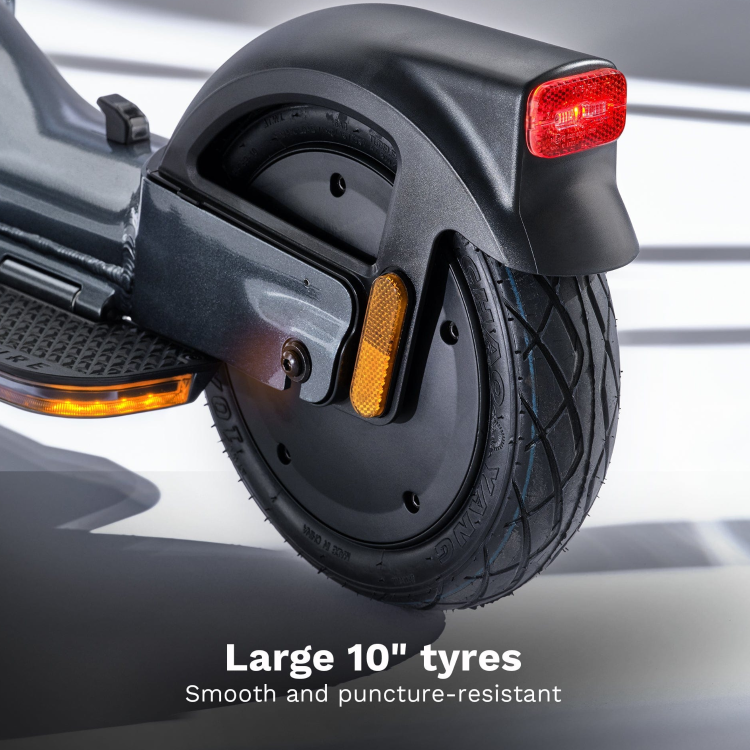 Vaša varnost je naša prioriteta. Dinamični kazalniki na krmilu in stopalkah zagotavljajo jasno signalizacijo, močna 150-lumnska sprednja luč pa omogoča varno vožnjo v slabih svetlobnih razmerah. Za dodatno varnost skrbi tudi zadnja zavorna luč, ki povečuje vašo vidnost za druge udeležence v prometu.