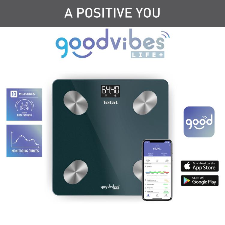 Ne glede na to, ali želite več energije, izgubiti kilograme ali si izoblikovati telo, se bo tehtnica Goodvibes prilagodila vašim potrebam. Ne meri samo telesne teže, ampak 10 telesnih meritev-med drugim ITT, maščobo in mišično maso-bolje spoznajte svoje telo, sprejmite prave odločitve in razkrijte svoje številke. Spoznajte pametno digitalno tehtnico z uporabniku prijazno povezano aplikacijo, ki vam bo pošiljala pozitivne vibracije!