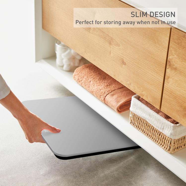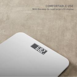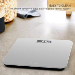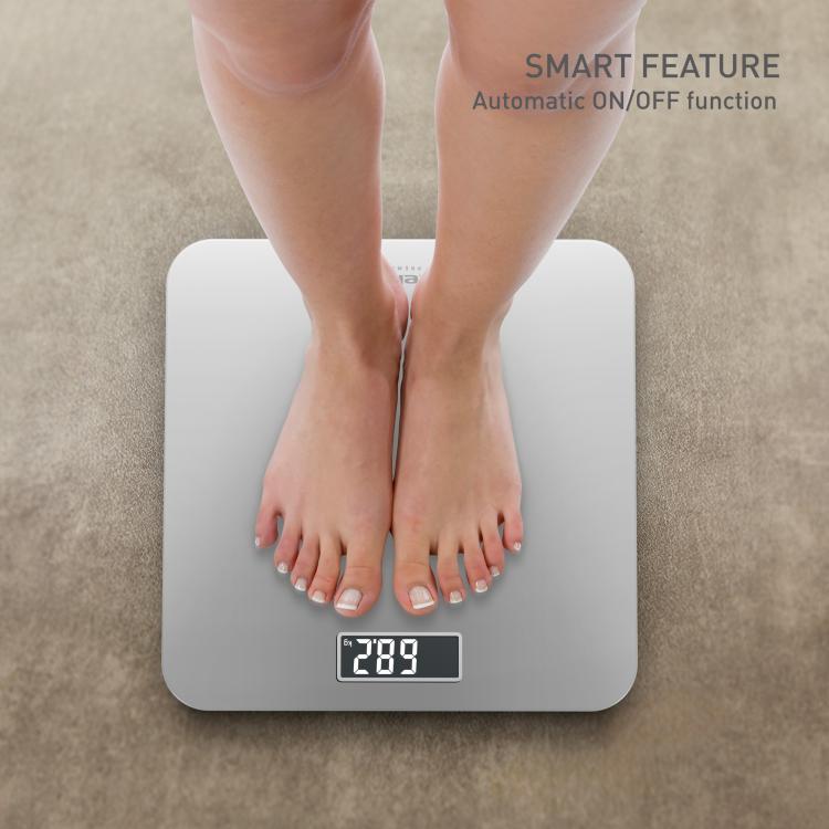 Preprostost in udobje! Pri tehtnici Premiss je vse v preprostosti. Naša tanka, moderna kopalniška tehtnica ima ploščo iz kaljenega stekla, lahko berljiv LCD-zaslon in nosilnost 160 kg. Preprosto stopite na tehtnico, da se samodejno vklopi, nato pa izberite med metričnimi in imperialnimi enotami. Tehtnica se po nekaj sekundah neuporabe samodejno izklopi.