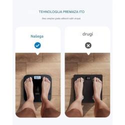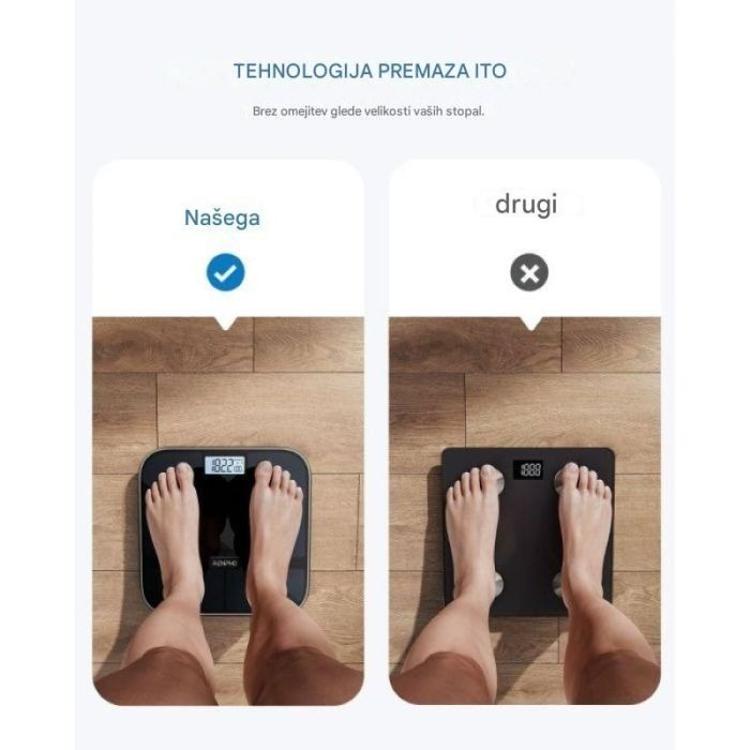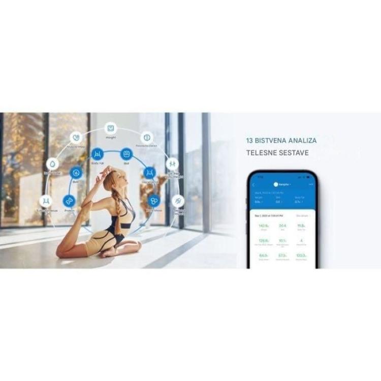 Ta digitalna kopalniška tehtnica prikazuje samo telesno težo in odstotek telesne maščobe. Če želite dostopati do več podatkov, je v aplikaciji na voljo še 13 drugih meritev, vključno z: težo, telesno maščobo, BMI, mišično maso, kostno maso, beljakovinami, podkožno maščobo, visceralno maščobo, telesno vodo, skeletno mišično maso, maso brez maščob, BMR in presnovno starostjo. Težo lahko preverite kadar koli, ne da bi odprli aplikacijo.