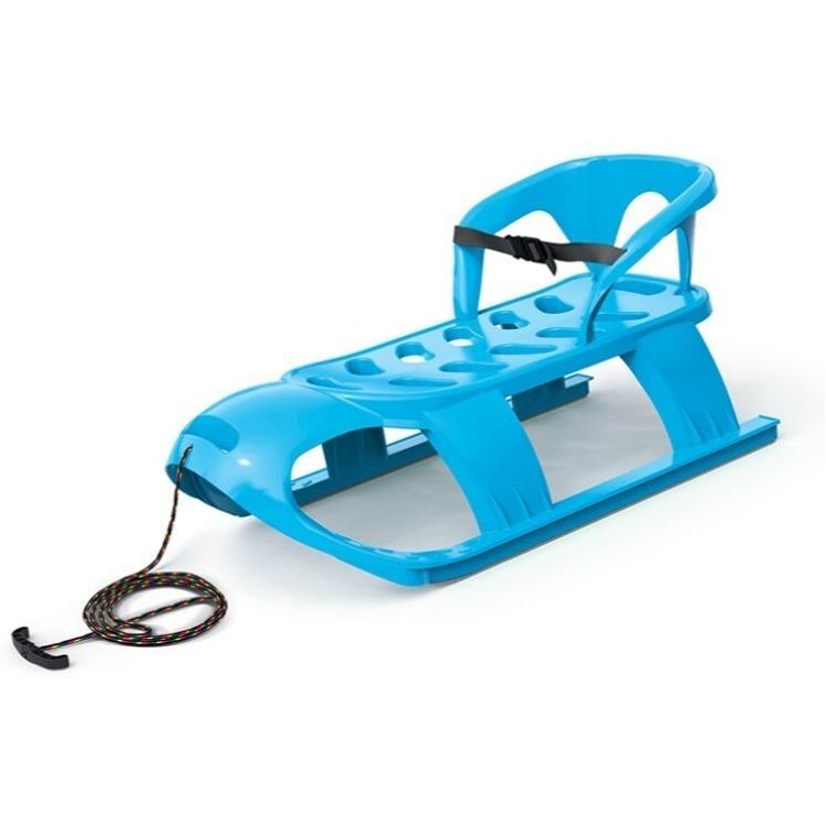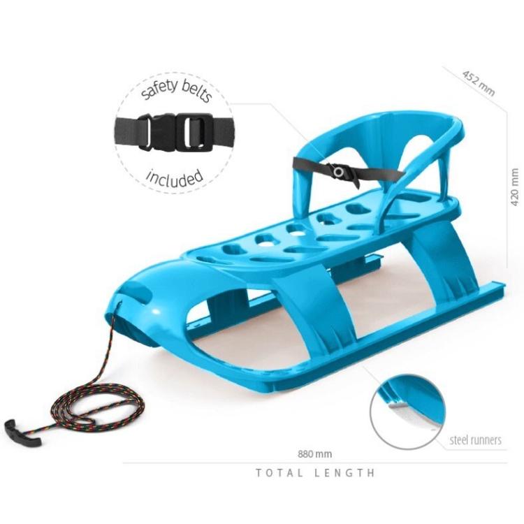 Otroške sani BEZZY SEAT s širokimi drsnimi ploskvami za cel sneg. Nameščen sedež z varnostnim pasom in pritrjena vrvica z držalom za vleko.