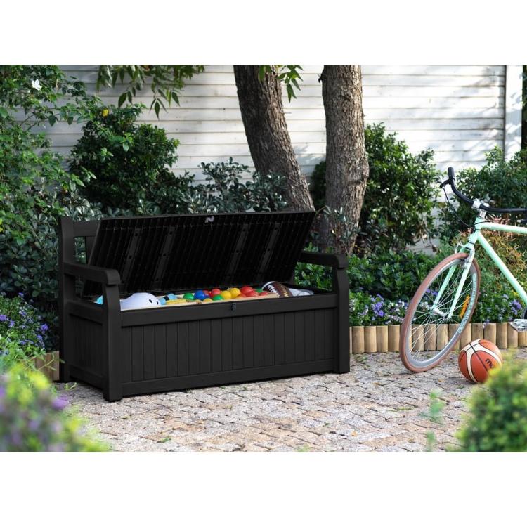 Elegantna klop ali funkcionalen zaboj za shranjevanje? Zakaj ne 2 v 1? Zaboj za shranjevanje EDEN GARDEN BENCH je genialna rešitev za tiste, ki želijo urediti svoj vrt na eleganten, a tudi praktičen način. Zahvaljujoč svoji prostornini bo primeren za odejo in blazine ter celo opremo za rekreacijo. Poleg tega površinska tekstura spominja na naravni les, kar odlično poudari čar in stil vsakega vrta.