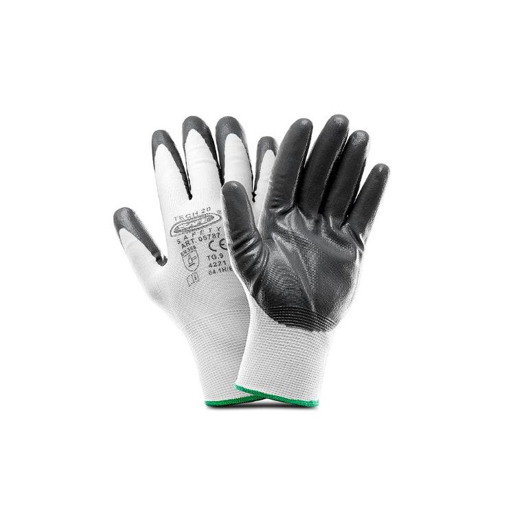 Rokavice TECH 20 GLOVE zaščitne rokavice EN 388: 4121X Velikost: ŠT. 10 CE certifikat: Na voljo na zahtevo. OVO kategorija: Osebna zaščitna oprema kategorije II. Opis: Belo – sive rokavice : Brezšivna najlonska podpora, nitrilni premaz na dlani , prezračen hrbet, elastično zapestje z robom. Priporočena uporaba: ZELO VISOKA SPRETNOST – OLJNE POVRŠINE Kovinsko-predelovalna industrija, Konstruktorska industrija, Servis pnevmatik in avtomobilov, Logistika, Industrija (transport, skladiščenje, pakiranje), lahka mehanska dela, vzdrževanje, priprava in pakiranje, proizvodnja, čiščenje, steklarska industrija, metalurgija, ravnanje z majhnimi deli. Navodila za uporabo: o navodilih za delo, shranjevanje, čiščenje in vzdrževanje