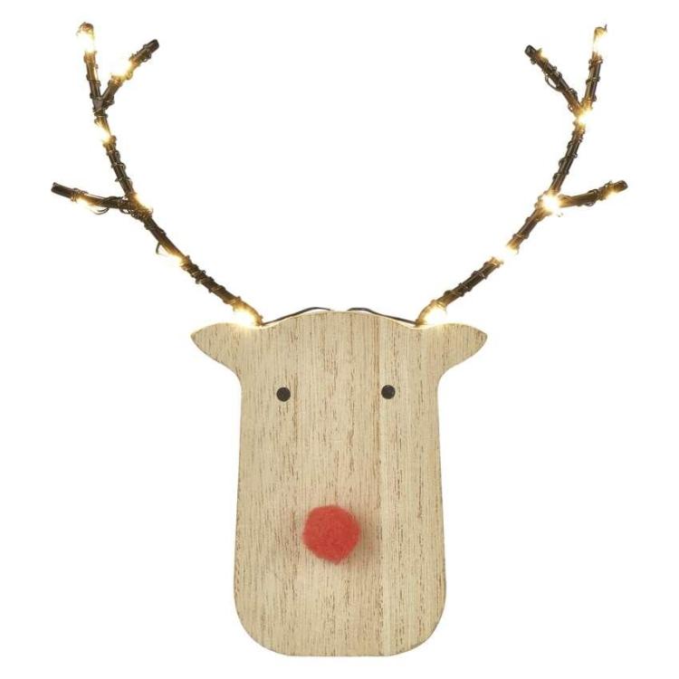 izdelek severni jelen, barva svetlobe topla bela, dimenzije 14,5 × 2 ×16 cm, uporaba notranja, programska ura , daljinski upravljalnik ne, tip napajanja baterija 2× AAA (priloženo), vir svetlobe LED, število LED 8, prihodna moč 0,36 W, izhodna napetost 3 V DC, zaščita IP20, življenjska doba 10 000 ur, material les, garancijska doba 2 leti