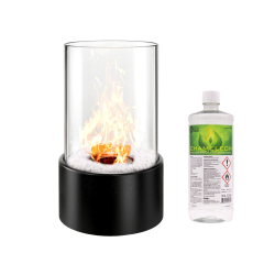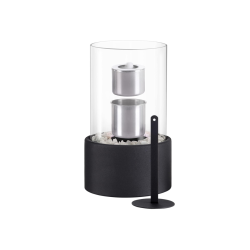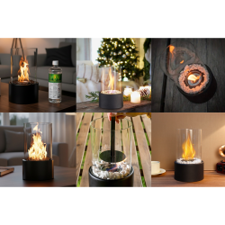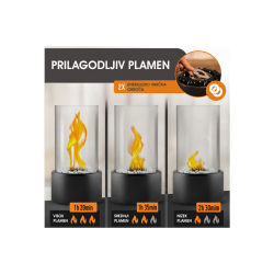 Kamin omogoča prilagodljivo višino plamena od 10 do 25 cm, odvisno od vaših želja. Zahvaljujoč večji 200‑ml posodi in priloženim obročem lahko plamen gori brez obroča do 1 h 20 min, s širokim obročem približno 1 h 35 min, z ozkim obročem pa do 2 h 30 min. Kamin je opremljen s keramično volno, ki skrbi za varno in daljše gorenje, ter borosilikatnim steklom, ki ščiti pred ognjem in je odporno na visoke temperature.