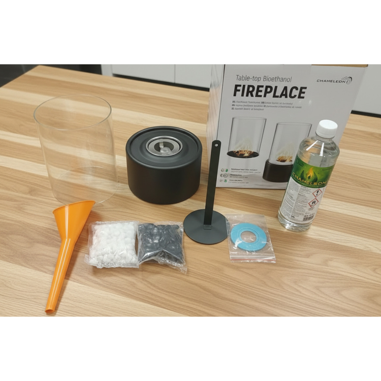 Tako kot starejši model ustvarja prijetno atmosfero, a v tej novi izdaji dobite večjo posodico za gorivo (200 ml) ter priloženo 1‑litrsko plastenko bioetanola za takojšnjo uporabo. Kamin je primeren za notranje in zunanje prostore in vključuje okrasne kamne (bele in črne) za še lepši videz.