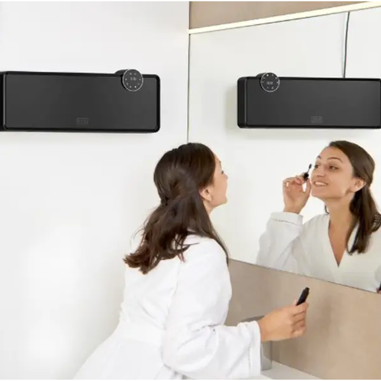 PRIMEREN ZA VSAK PROSTOR: Z priloženim stenskim nosilcem ga enostavno pritrdite, kamor ga potrebujete. Njegova odpornost na vlago (IPX2) omogoča varno uporabo tudi v kopalnici. Priporočljivo za površine do 20 m².