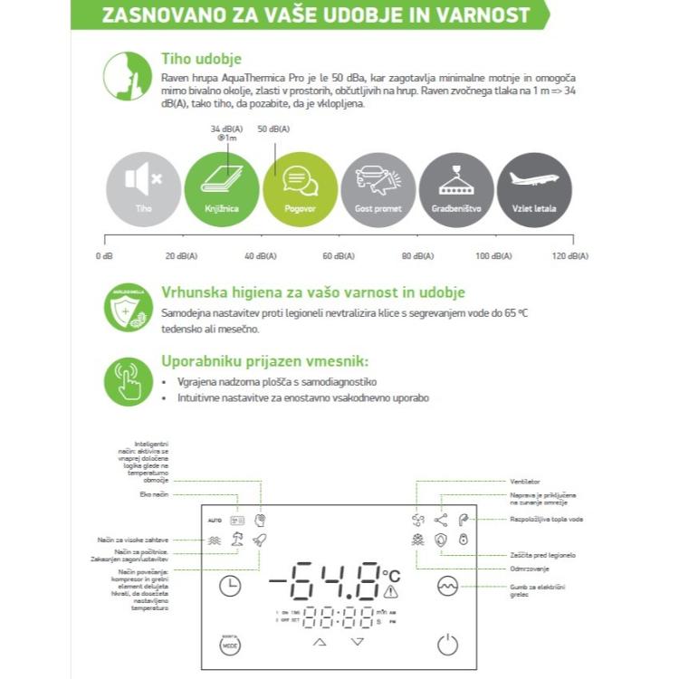 Z uporabo naravnega hladilnega sredstva R290 (propan) dosega AquaThermica Pro izjemno nizek potencial globalnega segrevanja (GWP) in ničelni potencial tanjšanja ozonske plasti (ODP). Z uporabo samo toplotne črpalke lahko segreje vodo do 65 °C, kar ponuja do 75 % prihranka energije v primerjavi s konvencionalnimi električnimi grelniki vode. Zaradi visokega koeficienta učinkovitosti (COP) – do 3,8 – je eden najučinkovitejših sistemov v svojem razredu.