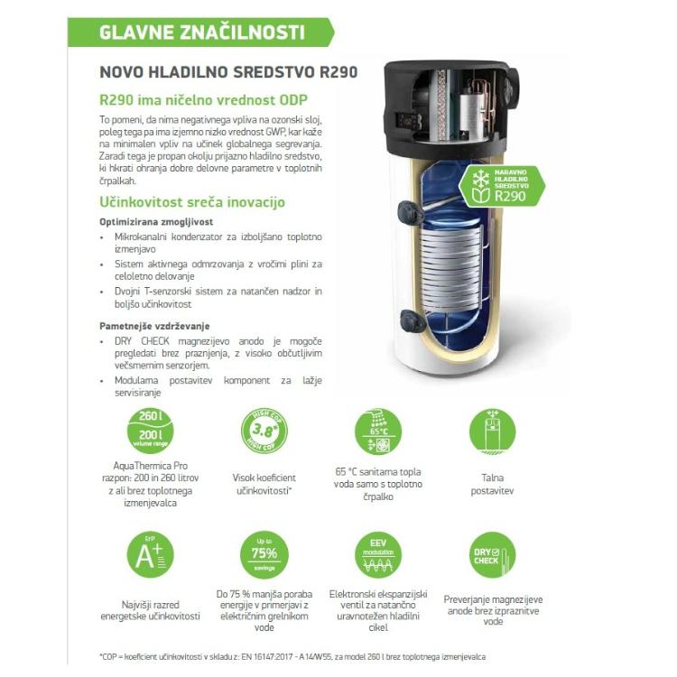 AquaThermica Pro s toplotnim izmenjevalnikom je samostoječa sanitarna toplotna črpalka zrak-voda, ki deluje na okolju prijazen propan (hladilno sredstvo R290) in se lahko priključi na druge vire energije, kot je kotel ali solarni sistem.