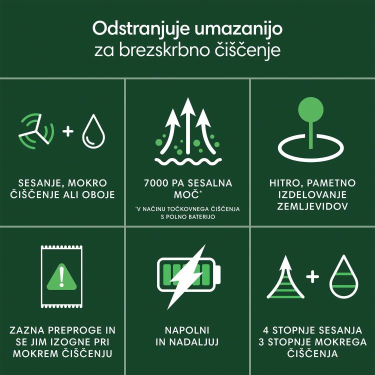 Poišče in odstrani smeti s skupno 7000 Pa* moči, intenzivno sesalno krtačo s ščetinami za več vrst tal, krtačo za pometanje robov, ki zajame umazanijo in prašne kepice, ter krpo za mokro brisanje iz mikrovlaken, ki poskrbi za sijoča in čista tla.