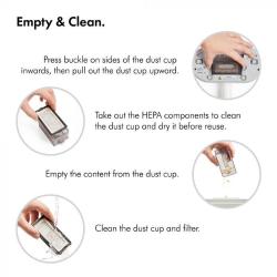 Z 0,3 l posodo za prah in HEPA filtrom je ta sesalnik enostavno, varno in higienično izprazniti. Eleganten in kompakten dizajn s 4-metrskim kablom ponuja dolg doseg, sesalnik pa je enostavno shraniti, ko s čiščenjem zaključite.