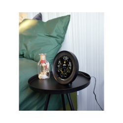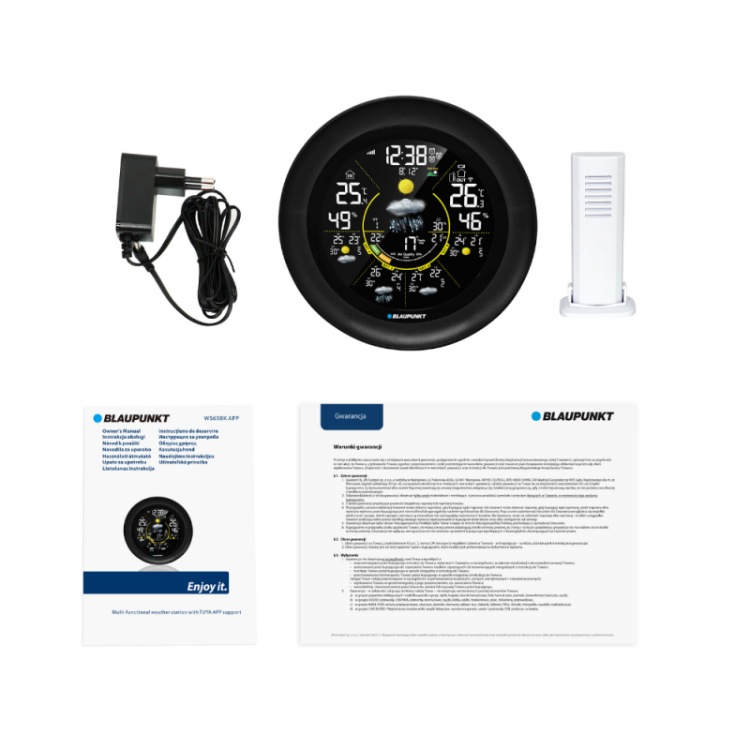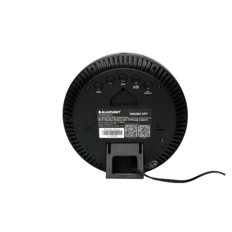 Blaupunkt WS65BK APP je sodobna vremenska postaja, ki združuje funkcije spremljanja vremenskih razmer z nadzorom kakovosti zraka. Napravo odlikuje okroglo ohišje, elegantna črna barva in enostavno berljiv barvni LCD zaslon.