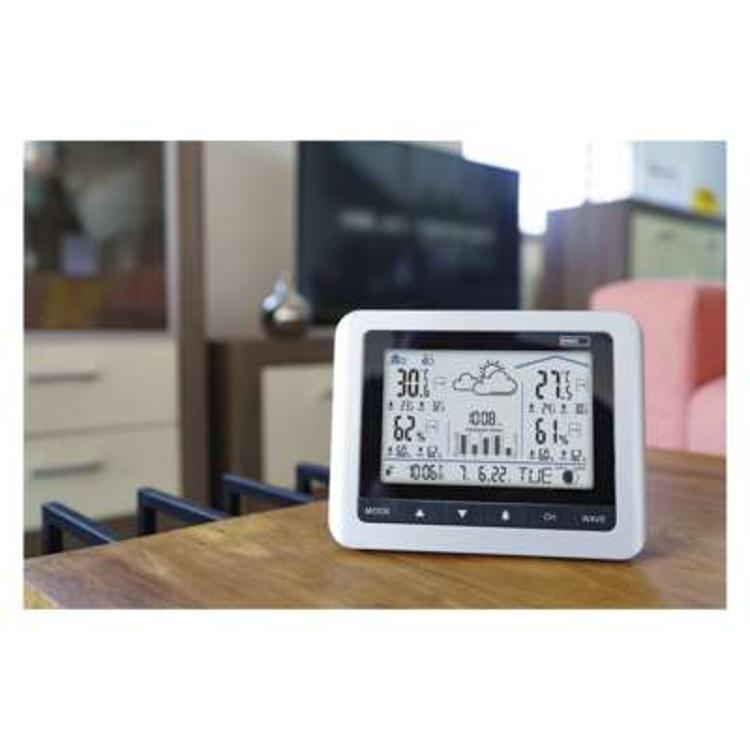 Brezžična vremenska postaja na belem osvetljenem zaslonu prikazuje številne uporabne podatke.