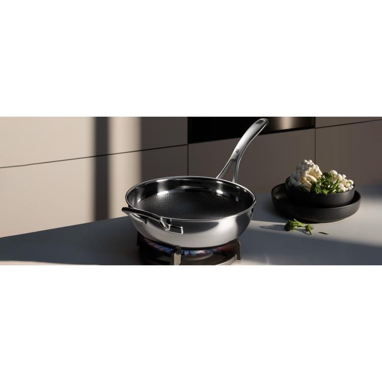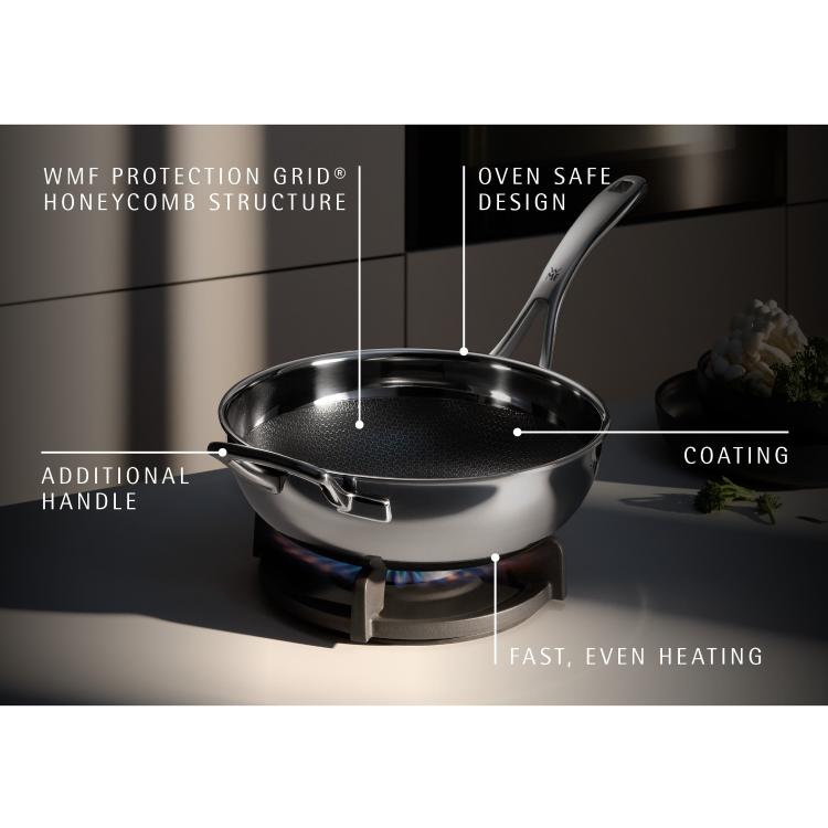 Od azijskega praženja pri zelo visokih temperaturah do priprave občutljivih sestavin z minimalno količino dodanega olja – ponev WMF Profi Resist Wok združuje najboljše iz obeh svetov. Z zasnovo, ki omogoča varno uporabo od kuhalne plošče do pečice v hipu, ter s priročnimi funkcijami, kot sta ročaja z zmanjšanim prevajanjem toplote in širok rob za lažje točenje, ta wok ponev obljublja popolne rezultate ob vsaki uporabi. Združljiva je z vsemi vrstami kuhalnih plošč, tudi z indukcijskimi.