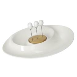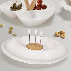 Servirni krožnik Andromeda je popoln dodatek k vaši kuhinji ali jedilni mizi. Z dvema ločenima predelkoma, ukrivljenih oblik omogoča, da med seboj enostavno ločite različne omake, prigrizke, vloženo zelenjavo, namaze, sadje in ostale jedi. Izdelan je iz belega porcelana, ki ga dopolnjuje podstavek iz bambusovega lesa, kamor lahko nataknete priložene vilice iz nerjavečega jekla in ročajem iz porcelana. Njegova čudovita bela barva bo lepo dopolnila vsako jedilno garnituro in ustvarila vzdušje miru in harmonije. Ni primeren za uporabo v mikrovalovni pečici in pomivanje v pomivalnem stroju.