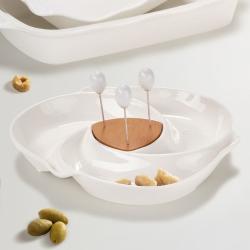 Servirni krožnik Vortice je popoln dodatek k vaši kuhinji ali jedilni mizi. S tremi ločenimi predelki, ukrivljenih oblik omogoča, da med seboj enostavno ločite različne omake, prigrizke, vloženo zelenjavo, namaze, sadje in ostale jedi. Izdelan je iz belega porcelana, ki ga dopolnjuje podstavek iz bambusovega lesa, kamor lahko nataknete priložene vilice iz nerjavečega jekla in ročajem iz porcelana. Njegova čudovita bela barva bo lepo dopolnila vsako jedilno garnituro in ustvarila vzdušje miru in harmonije. Ni primeren za uporabo v mikrovalovni pečici in pomivanje v pomivalnem stroju.