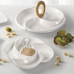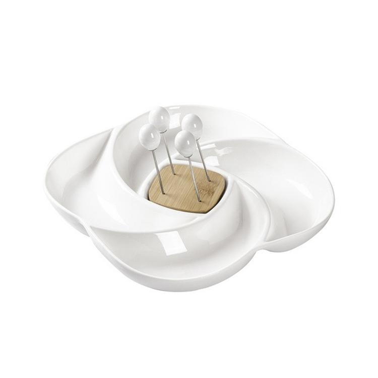Servirni krožnik je popoln dodatek k vaši kuhinji ali jedilni mizi. S štirimi ločenimi predelki in elegantno ukrivljeno obliko omogoča, da enostavno ločite različne omake, prigrizke in druge jedi. Izdelan je iz belega porcelana, ki ga dopolnjuje podstavek iz bambusovega lesa, kamor lahko nataknete priložene vilice iz nerjavečega jekla z ročajem iz porcelana. Njegova čudovita bela barva bo lepo dopolnila vsako jedilno garnituro ter ustvarila vzdušje miru in harmonije. Izdelek ni primeren za mikrovalovno pečico in pomivanje v pomivalnem stroju.