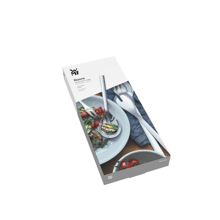 Odkrijte popoln jedilni pribor za vsako priložnost. Kolekcija Nuova znamke WMF predstavlja brezčasen, a hkrati funkcionalen nabor različnih kosov pribora – skoraj 50 specializiranih elementov, od jedilnega pribora do servirnih pripomočkov – ki vsak obrok spremenijo v pravo doživetje. Ti skrbno izbrani servirni pripomočki so popolna dopolnitev vsake lepo pripravljene mize. Set vsebuje 4 kose – par servirnih žlic za solato, servirno žlico in vilico – je pakiran v visokokakovostni darilni zložljivi škatli z ilustracijo.