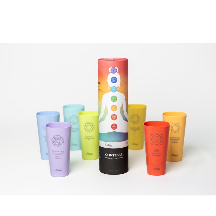 A set of 7 colorful glasses with affirmations symbolizing the seven chakras. They serve as a daily reminder to choose thoughts that benefit you. Made from sustainable materials, they are a perfect gift for balance and well-being.