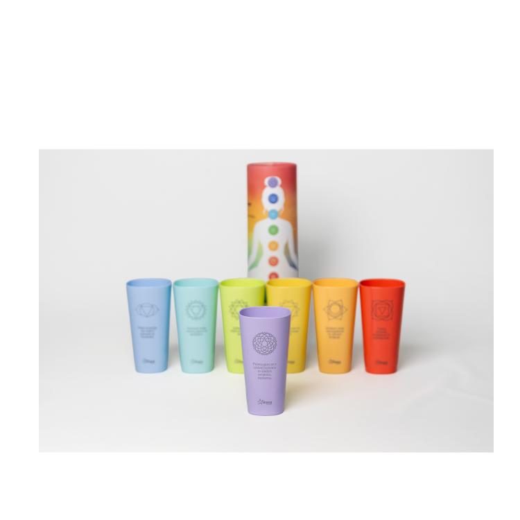 - 7 unikatnih afirmacijskih kozarcev – vsak predstavlja eno čakro (od korenske do kronske) in vključuje navdihujočo pozitivno misel oz. Afirmacijo.