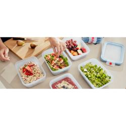 OneClick, revolucionarne posode za shranjevanje so zasnovane za udobje in zanesljivost. Te posode ponujajo preprost mehanizem za odpiranje in zapiranje z enim klikom. Močan neprepustni sistem s trdno pritrjenim notranjim tesnilom zagotavlja, da vaša hrana ostane dolgo sveža.