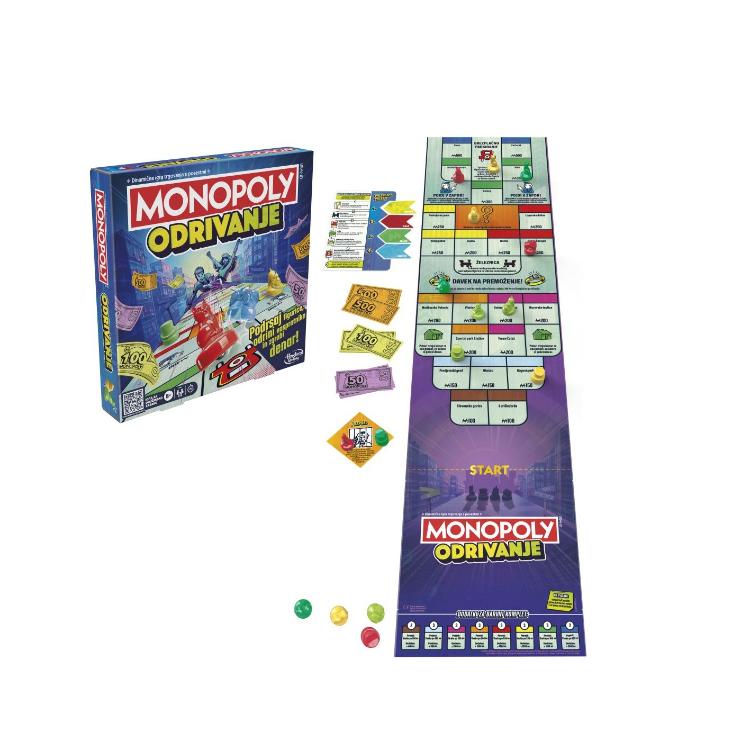 Igra Monopoly Odrivanjeje družinska družabna igra pri kateri žetoni drsijo po plošči in grabijo denar! V napredni in aktivni različici igre Monopoly se pomerite z nasprotniki v obračunu žetonov! Igralci igrajo v krogih, pri čemer izmenično drsijo svoje žetone po dolgi igralni plošči in poskušajo pristati na zemljiščih.