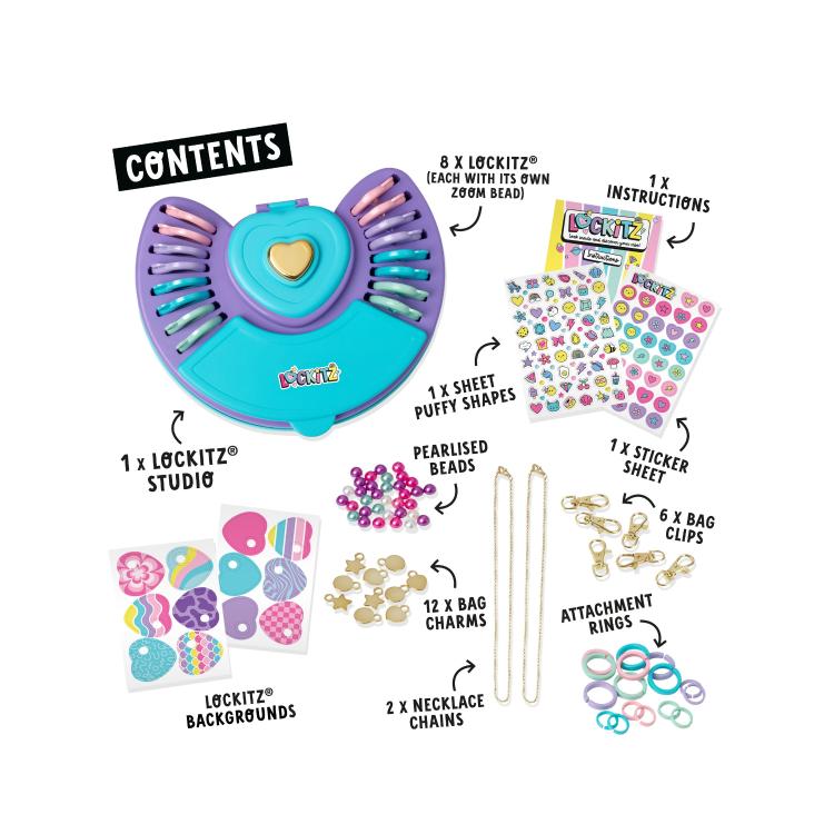 Vsebuje vse, kar potrebuješ za oblikovanje 6 čudovitih obeskov za torbe in 2 ogrlici, ki jih lahko znova in znova sestavljaš!