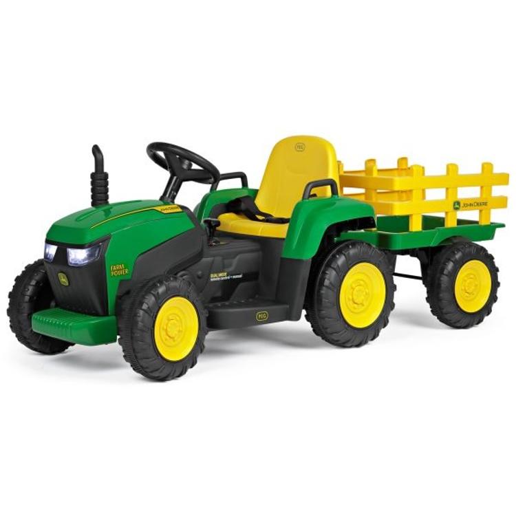 John Deere Farm Power je primeren za otroke od 18 mesecev naprej, z največjo dovoljeno težo do 30 kg, dodatno pa omogoča še 10 kg nosilnosti v snemljivi prikolici. Traktor je opremljen tudi z izjemno oprijemljivimi profiliranimi gumami, ki zagotavljajo varno in stabilno vožnjo po različnih terenih.